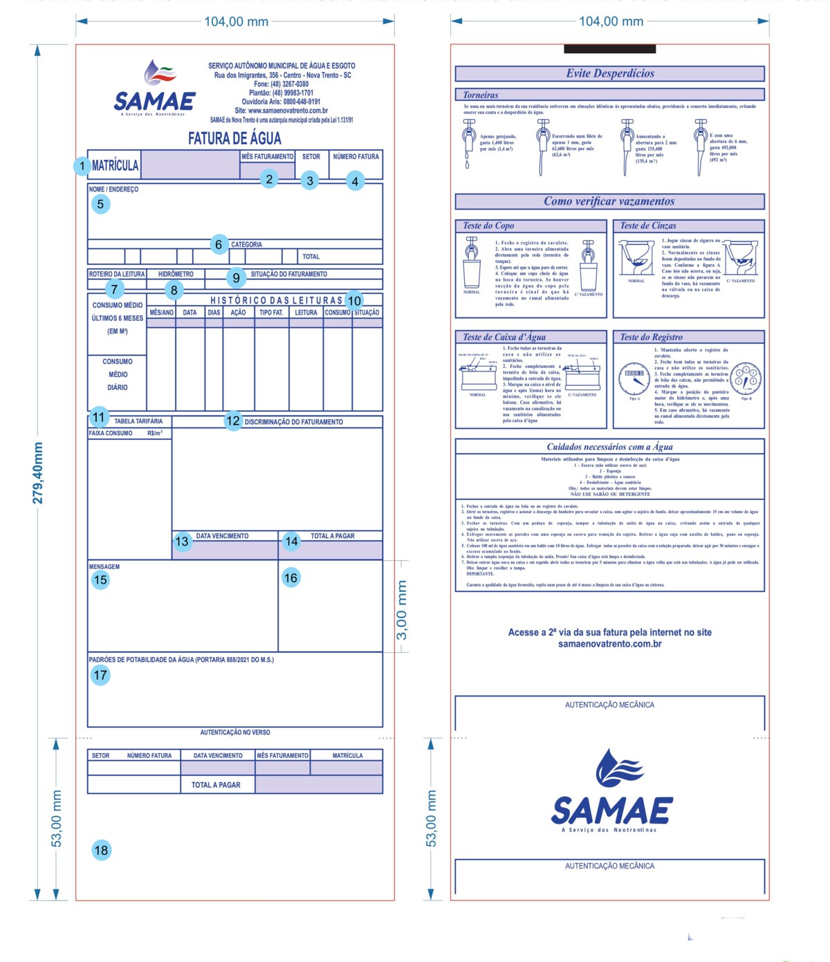 01 - Matricula: Este número identifica o usuário no sistema de cadastro de usuários do SAMAE. Tenha sempre em mãos esse número para solicitar informações sobre sua fatura.